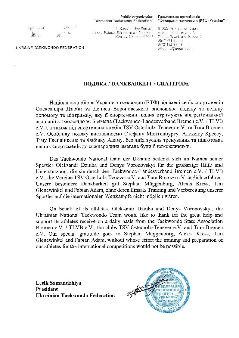 Zu diesem Anlass wurde ein Dankesschreiben vom ukrainischen Taekwondoverband verfasst, über den sich die gesamte Abteilung sehr gefreut hat.