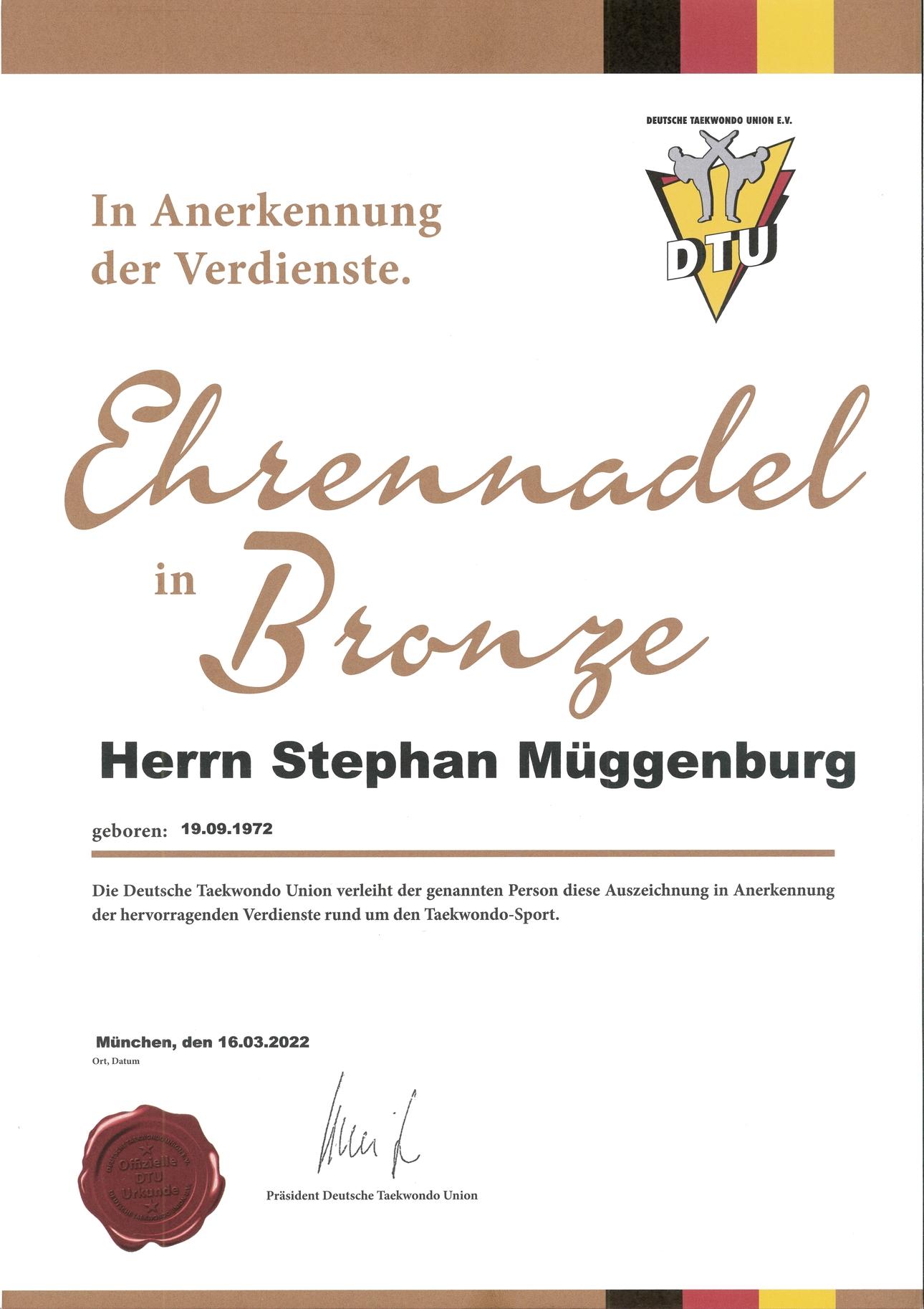 Unserem Abteilungsleiter und Gründer Stephan Müggenburg wurde im Zuge der Verleihung des Bronzenem Vereinsjubiläums, die Ehrennadel in Bronze der DTU verliehen. Diese Auszeichnung erhielt Stephan aufgrund seiner Verdienste rund um den Taekwondo-Sport und seinem besonderen Engagement.