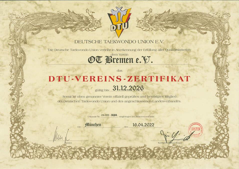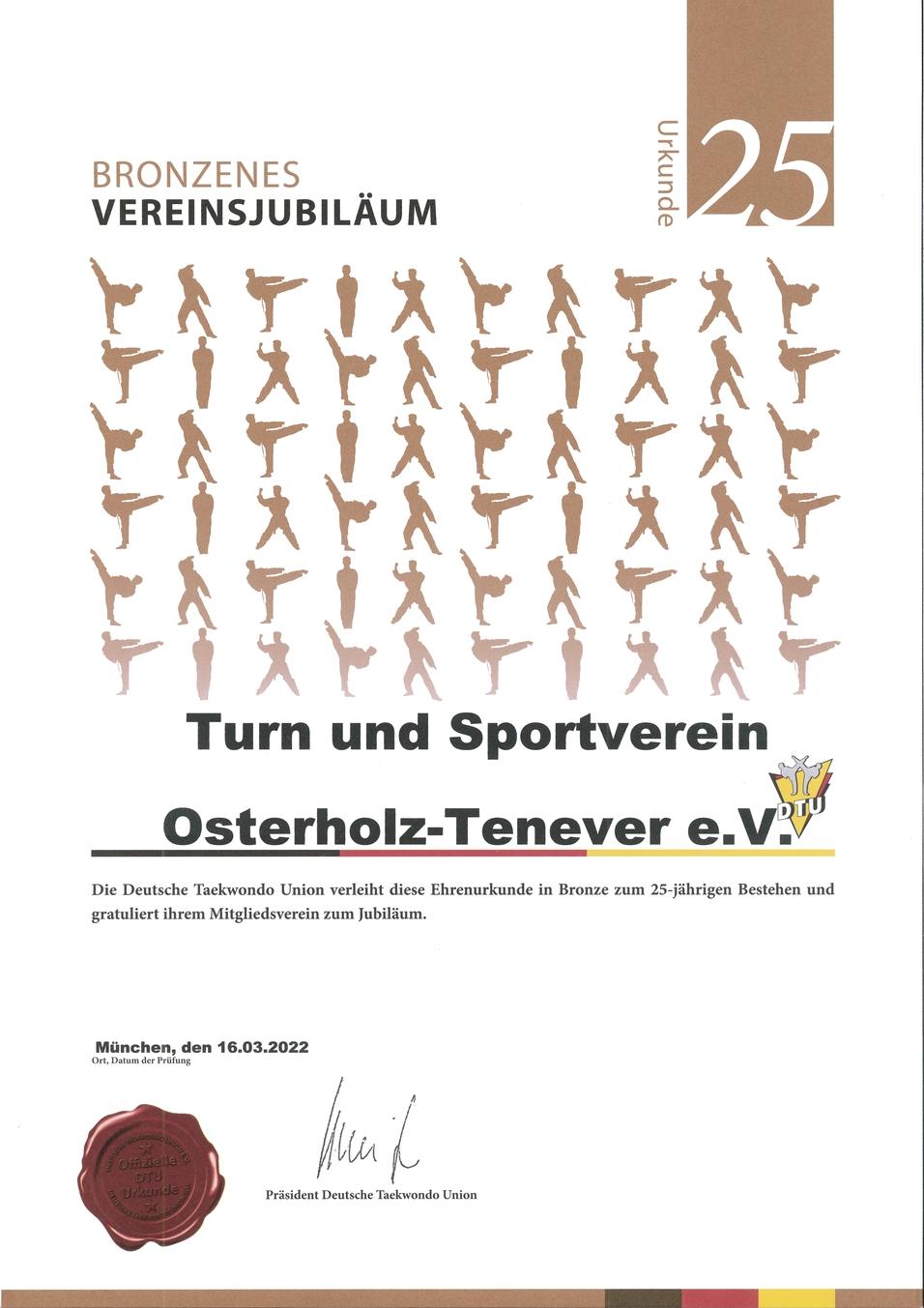 Zum Anlass des 25-jährigen Bestehens haben wir unser Vereins-Zertifikat der Deutschen Taekwondo Union erneuern lassen, welches bis Ende 2026 gültig ist. Dieses steht für die Erfüllung aller Qualitätskriterien rund um den Taekwondo-Sport.