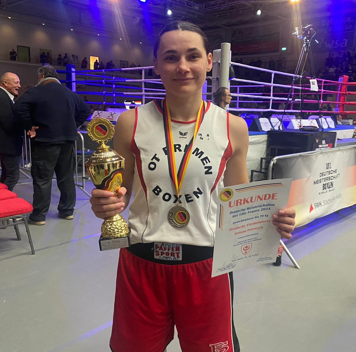 Tetiana Petrovych hat an der 101. Elite Deutsche Meisterschaft vom 19.11.-23.11.2024 in Halle (Saale) teilgenommen und OT Bremen vertreten. Sie war die einzige Boxerin aus Bremen.