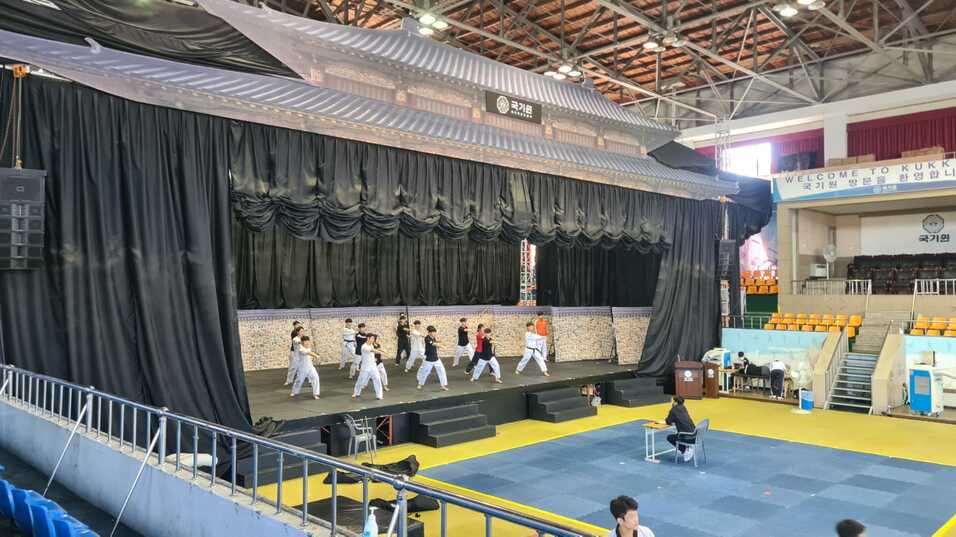 Nach einem steilen Aufstieg und dem Passieren des Eingangsbereichs trafen wir auf den Bus des KUKKIWON Taekwondo Demonstration Teams. Ein glücklicher Zufall, dass das Demo-Team an diesem Tag für ihre zahlreichen Auftritte in der großen Sporthalle trainierte. Der Eingang war für jeden zugänglich, weshalb wir auf der Tribüne, die die ganze Halle umschloss, Platz nahmen. Auf einer Seite der Halle befand sich eine große Bühne, auf der Schwarzgurte ihr Bruchtest-Programm einstudierten. Dabei übten sie Bretter in mehreren Meter Höhe mit unterschiedlichen Tritten zu zertreten. Das alleine war eindrucksvoll genug, aber die Sportler performten zusätzlich Schrauben und Saltos vor ihren Kicks. Eine Mischung aus dem Kampfsport Taekwondo und Akrobatik. Auf der anderen mit Matten ausgelegte Seite der Halle studierte eine Gruppe von Schwarzgurten einen Taekwondo-Tanz zu koreanischen Popsongs ein. Die Begeisterung und die Energie der Sportler waren wirklich ansteckend! Auch die präzise ausgeführten Techniken und die Synchronität waren so eindrucksvoll, dass wir mit einem großen Lächeln und viel Motivation für unser eigenes Training die Sporthalle nach etwa einer Stunde verließen.